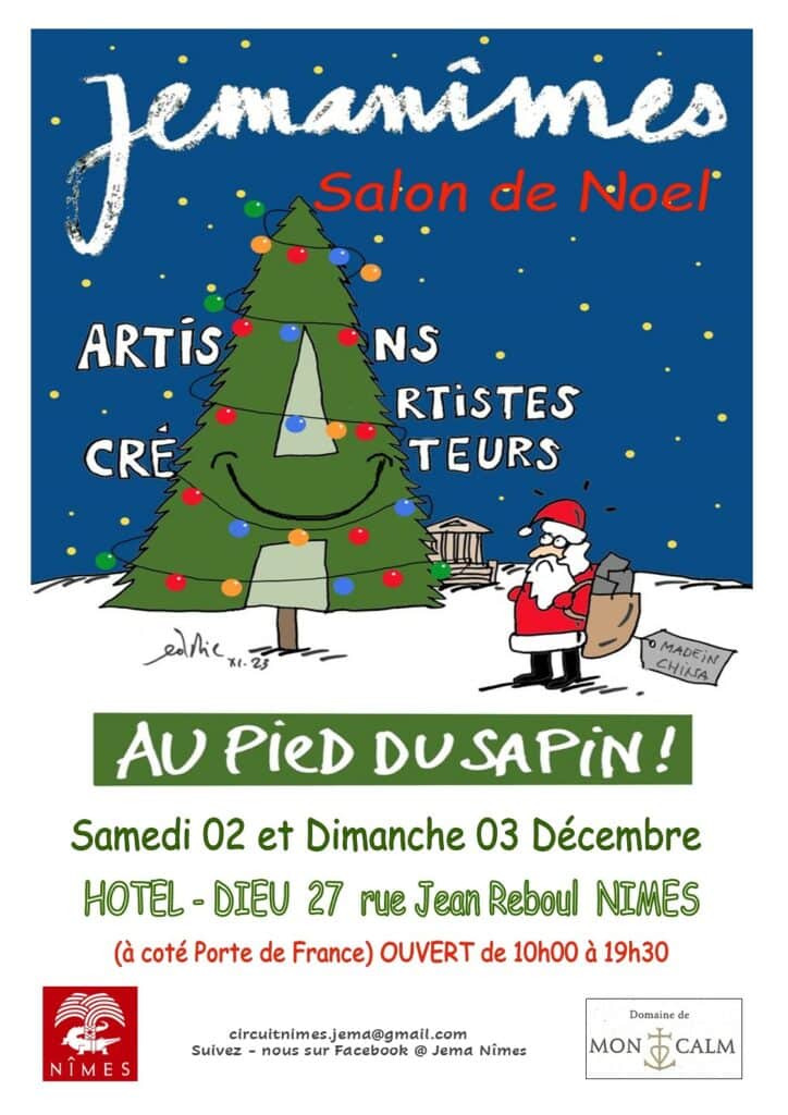 C’est avec joie que je participe à l’édition au pied du sapin à l’Hôtel Dieu rue Jean Reboul à Nîmes le 3 et 4 décembre. Merci à notre Eddie Pons national pour sa superbe affiche!