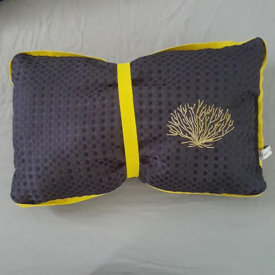 Un motif damassé noir et une broderie corail jaune pour ce chic petit coussin rectangle.