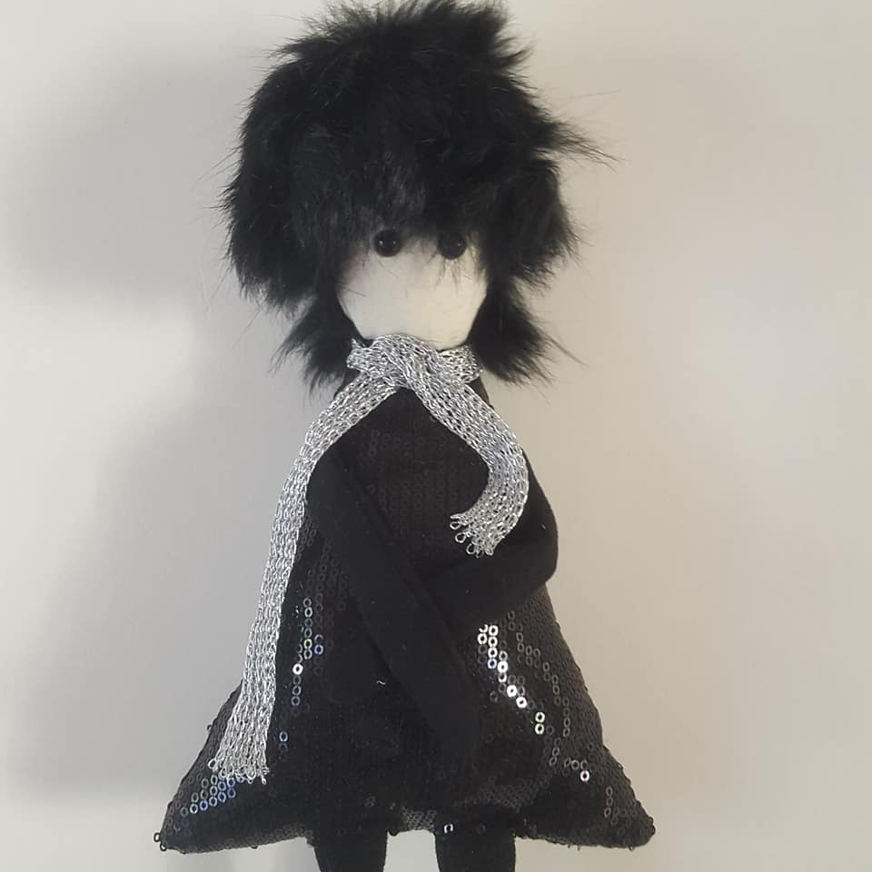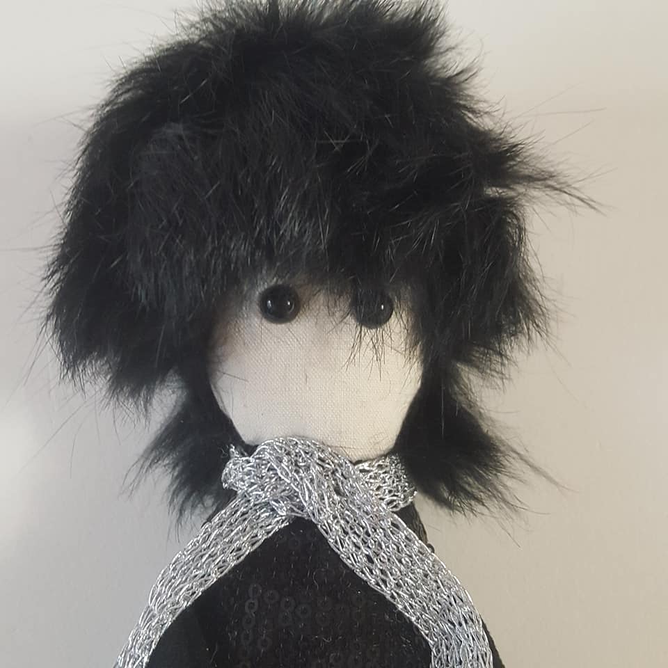 Matières: techniques mixtes, renard, suédine noire, tissus pailleté, yeux securit, pvc.