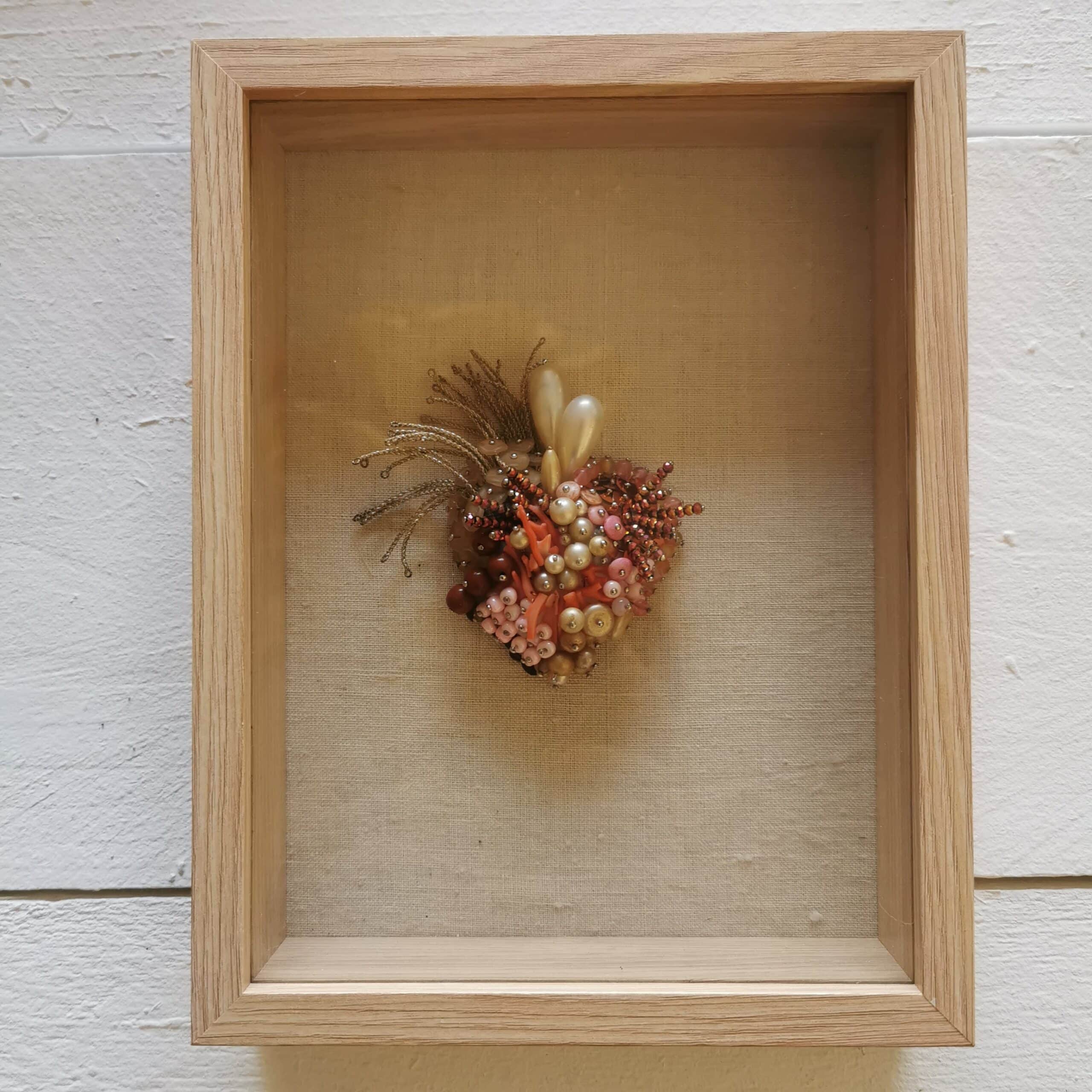 Technique mixte pour cet objet à suspendre ou à offrir: perles de nacre anciennes, coquillages, verre, sequins, perles de verre, corail ancien, passementerie ancienne de chez Houlès au fil d’or et épingles à chapeaux…
