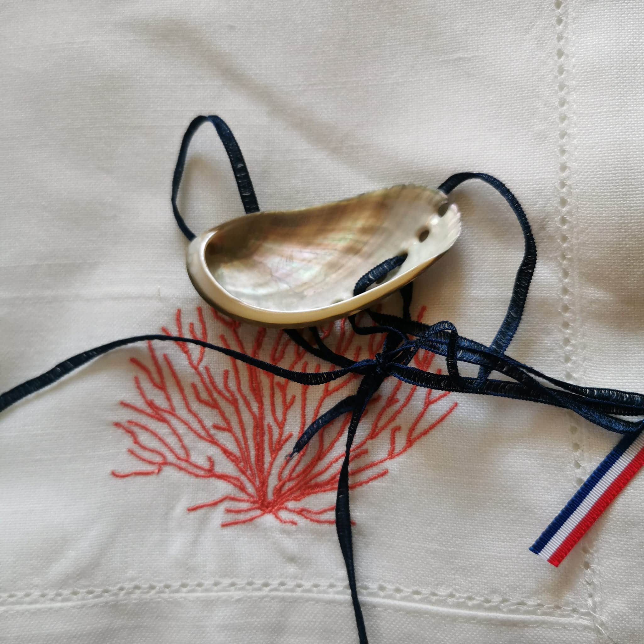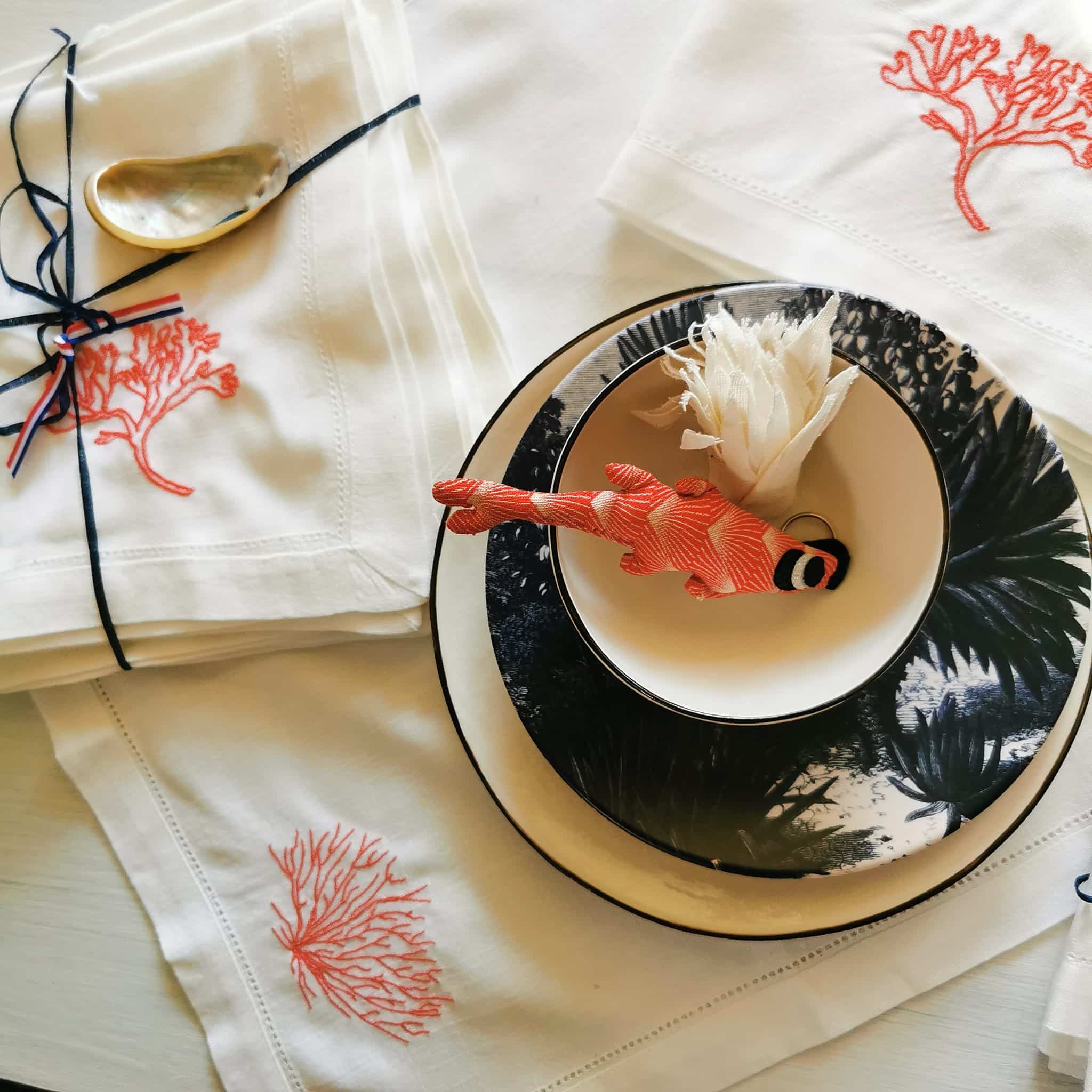 Lot de 6 serviettes en lin et coton , broderie corail corail.