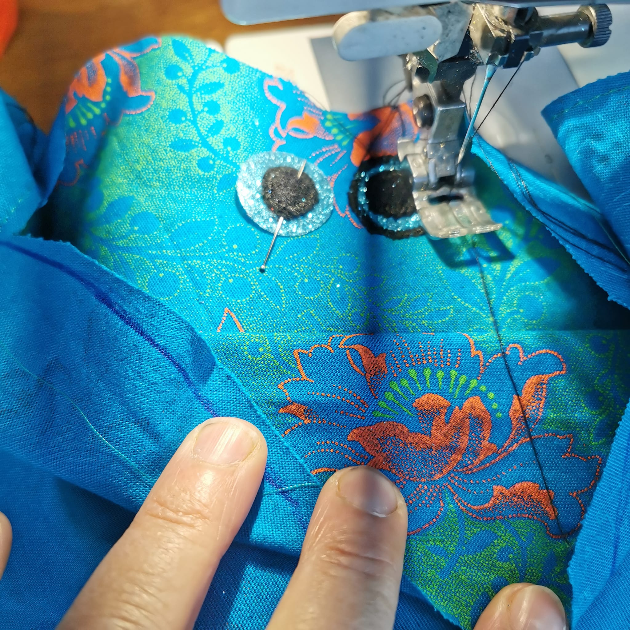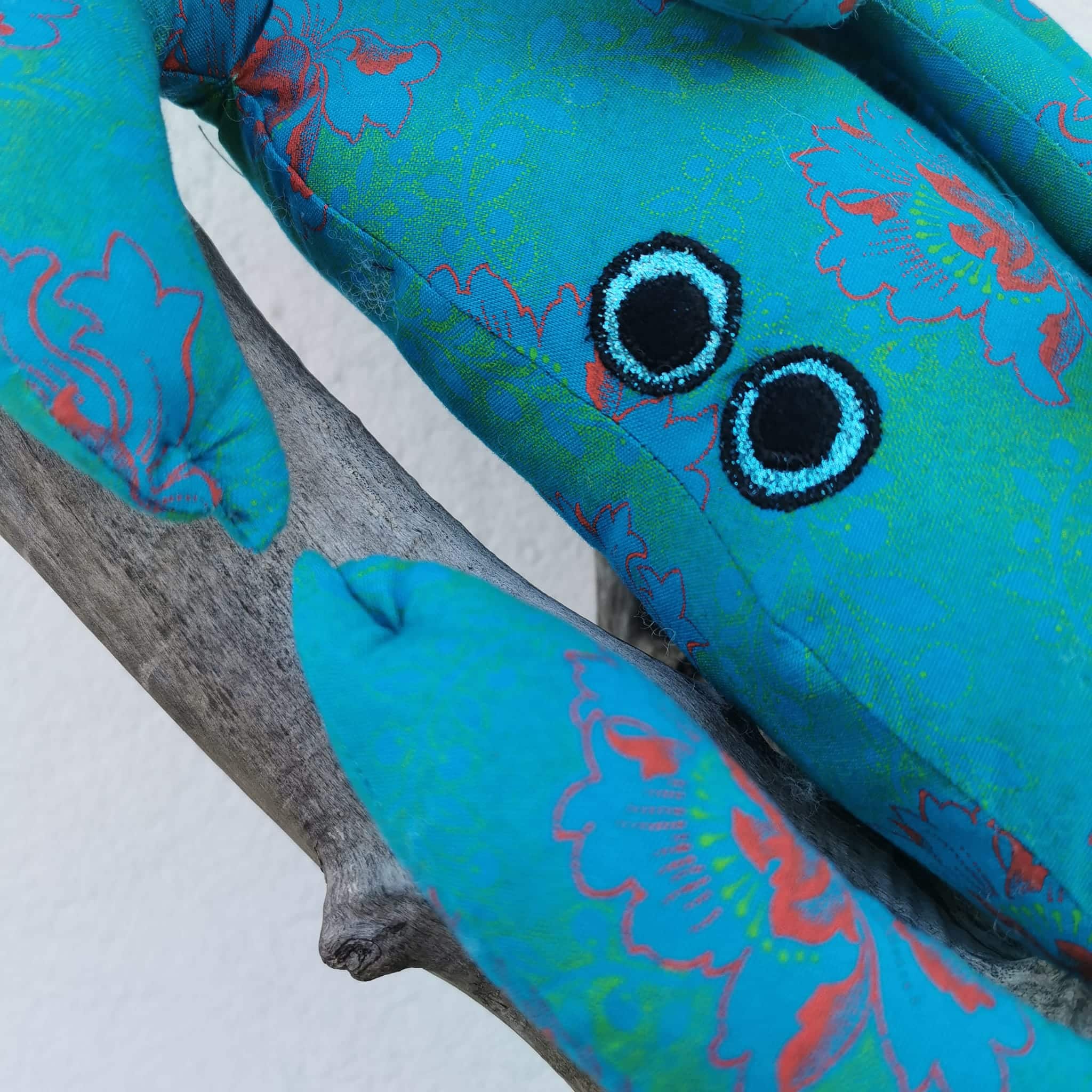 Coton turquoise fleuri, yeux appliqués dorés.