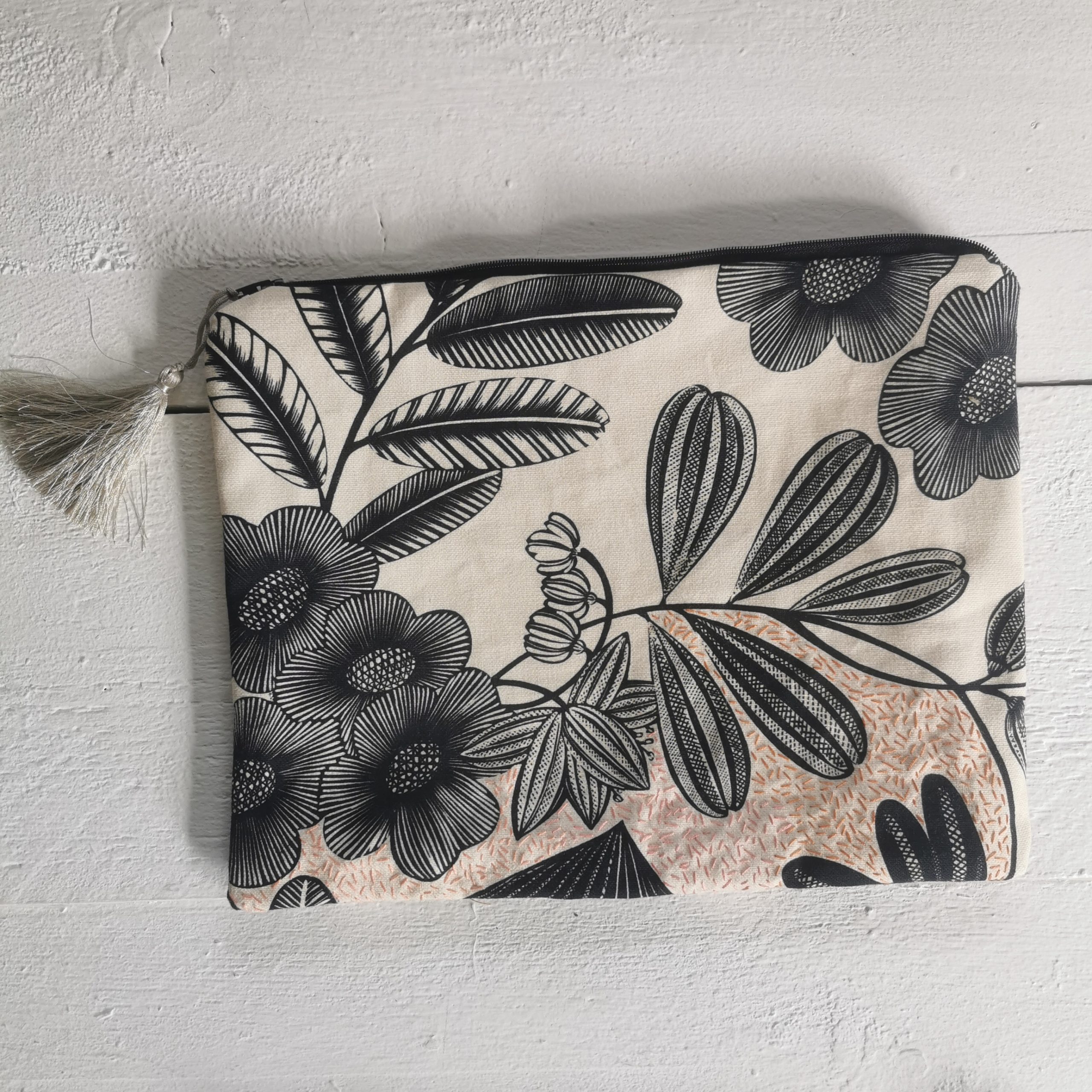 Pochette doublée en coton beige et noir avec broderies main grain de riz pour ajouter du volume et de la matière.