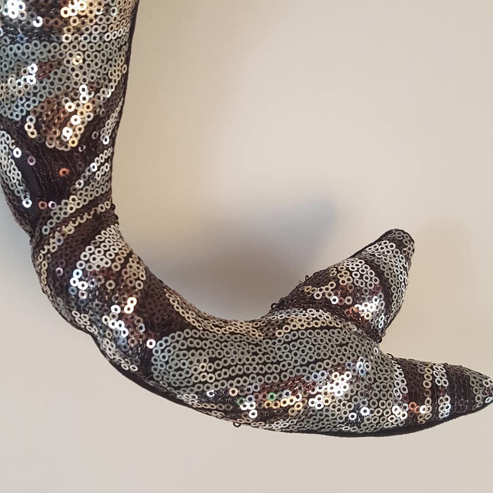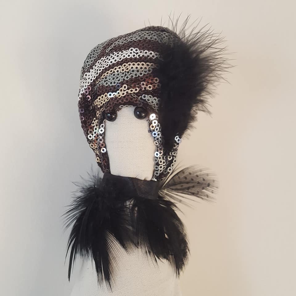 Inspirée des comédies musicales, au gré de mes trouvailles et de mes tissus glanés ici ou là, la sirène se part de paillettes et de plumes.